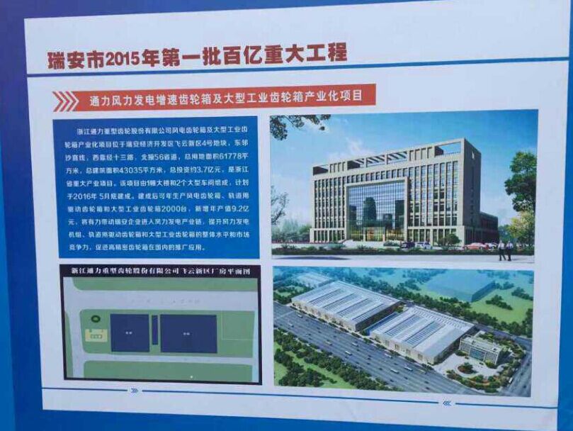 通力風電齒輪箱及大型重載齒輪箱產業化項目位于瑞安經濟開發區飛云新區4號地塊,總用地116畝,是瑞安市百億投資重大項目之一,是浙江省重大產業項目。該項目建成后用于生產風電齒輪箱、軌道用驅動齒輪箱和大型重載齒輪箱,該項目的建設能夠提升通力公司的技術創新能力和市場競爭力,促進公司高精密齒輪箱在國內的推廣應用。