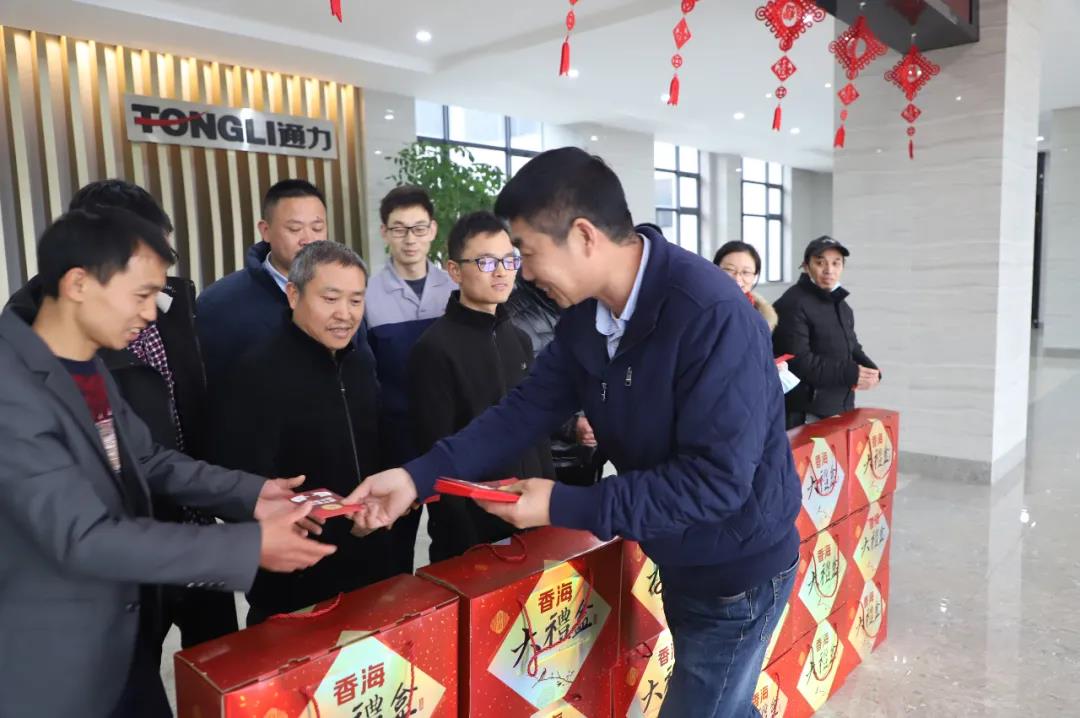 2月8日(臘月二十七),為響應(yīng)國家鼓勵企業(yè)職工就地過年的號召,為給予今年留在瑞安就地過年的通力員工新年祝福和溫暖,通力黨支部、工會連同行政部特為通力留瑞就地過年的職工代表們送上新春大禮包,祝愿員工們新春愉快。公司黨支部書記項建設(shè)代表公司向員工們一一送上禮包。