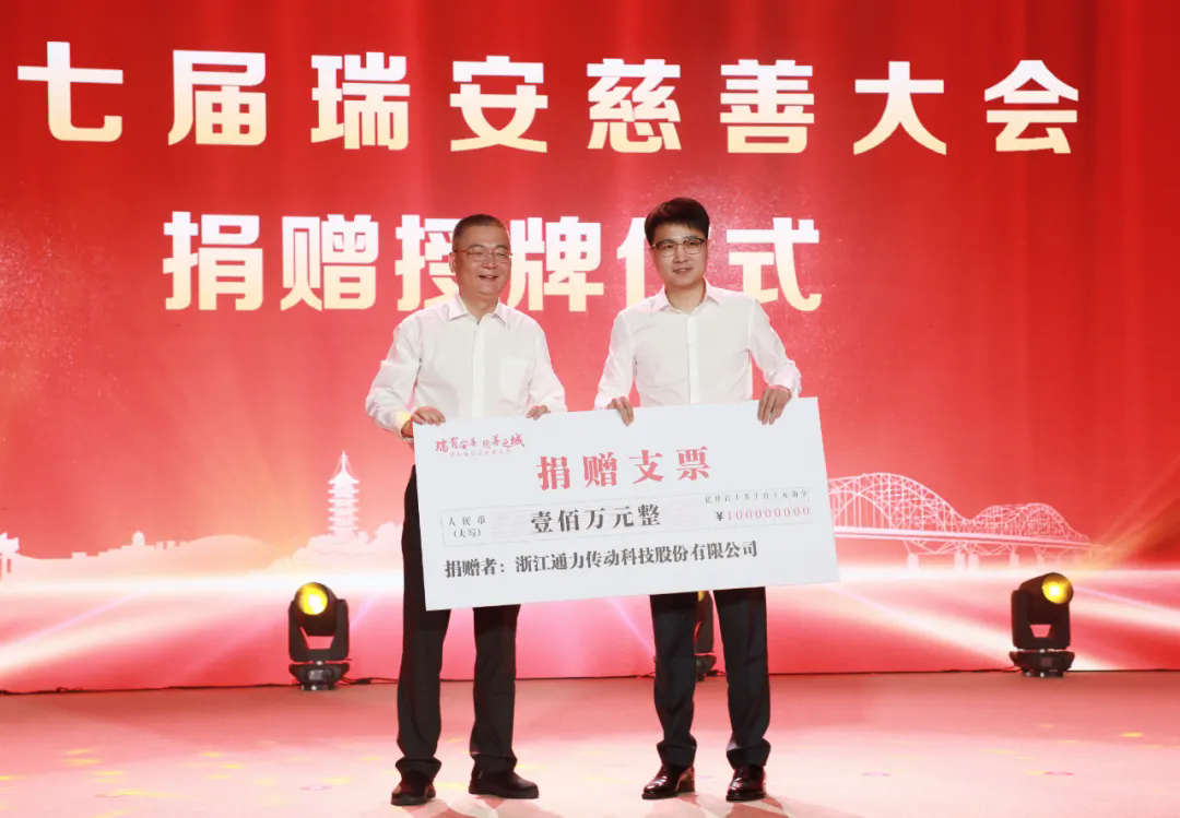 為合力打造共同富裕示范區縣域標桿,響應瑞安市委市府號召,通力科技總經理項純堅代表通力科技向大會捐贈100萬元。